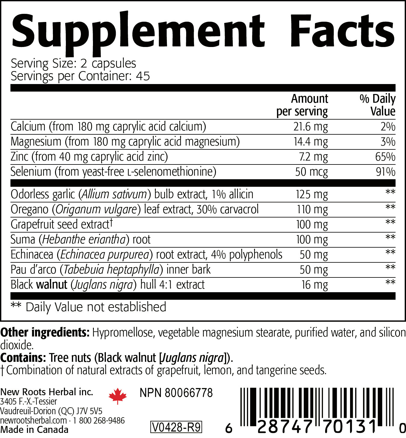 | Ingredients | Caprylic acid (calcium caprylate) 90 mg Caprylic acid (magnesium caprylate) 90 mg Odourless garlic (Allium sativum) bulb extract, 1% allicin 62.5 mg Oregano (Origanum vulgare) leaf extract, 30% carvacrol 55 mg Grapefruit seed extract* 50 mg Suma (Hebanthe eriantha) root 50 mg Echinacea (Echinacea purpurea) root extract, 4% polyphenols 25 mg Pau d’arco (Tabebuia heptaphylla) inner bark 25 mg Caprylic acid (zinc caprylate) 20 mg Black walnut (Juglans nigra) hull 4:1 extract 8 mg Selenium (from yeast-free ʟ‑selenomethionine) 25 mcg |