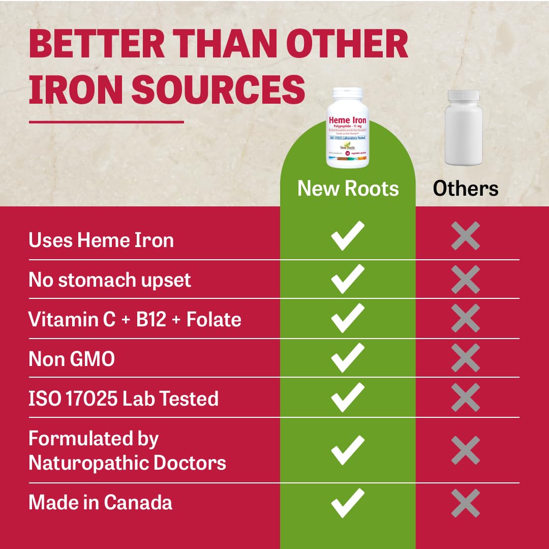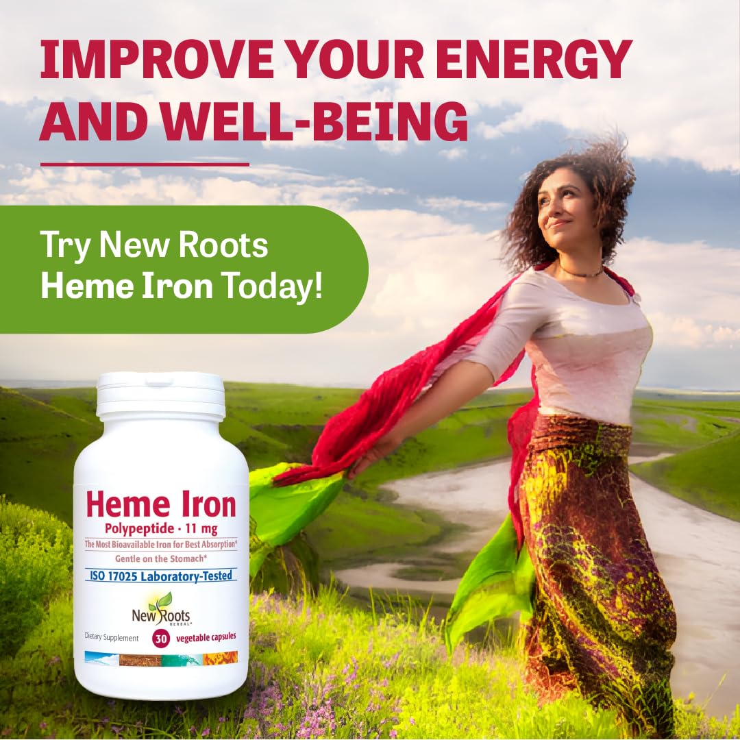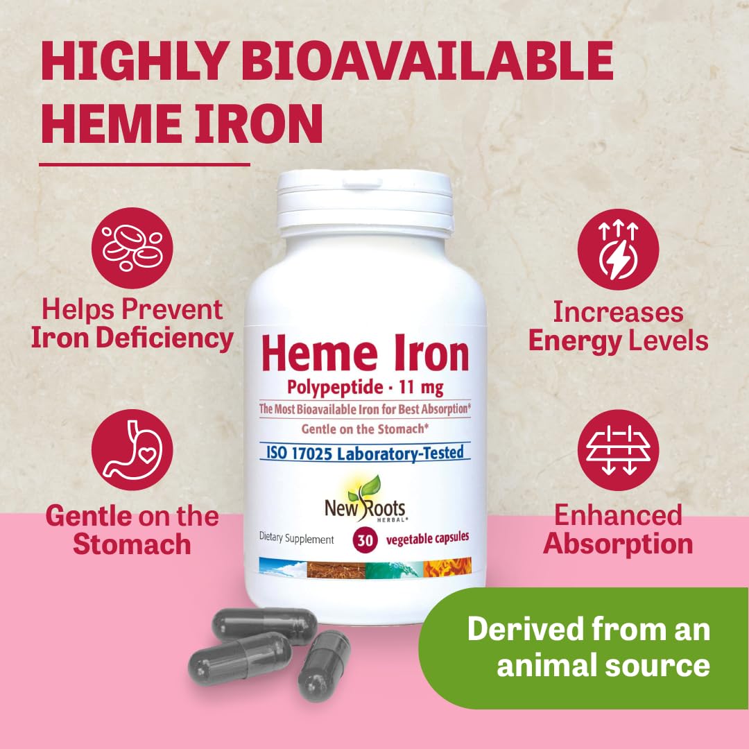 - New Roots Herbal’s Heme Iron is formulated with complementary nutrients to enhance intestinal iron absorption and hemoglobin synthesis