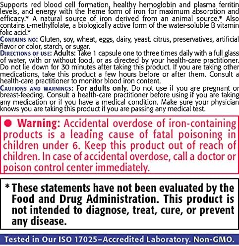 - Supports red blood cell formation, plasma ferritin levels, and energy with the heme form of iron for maximum absorption and efficacy.