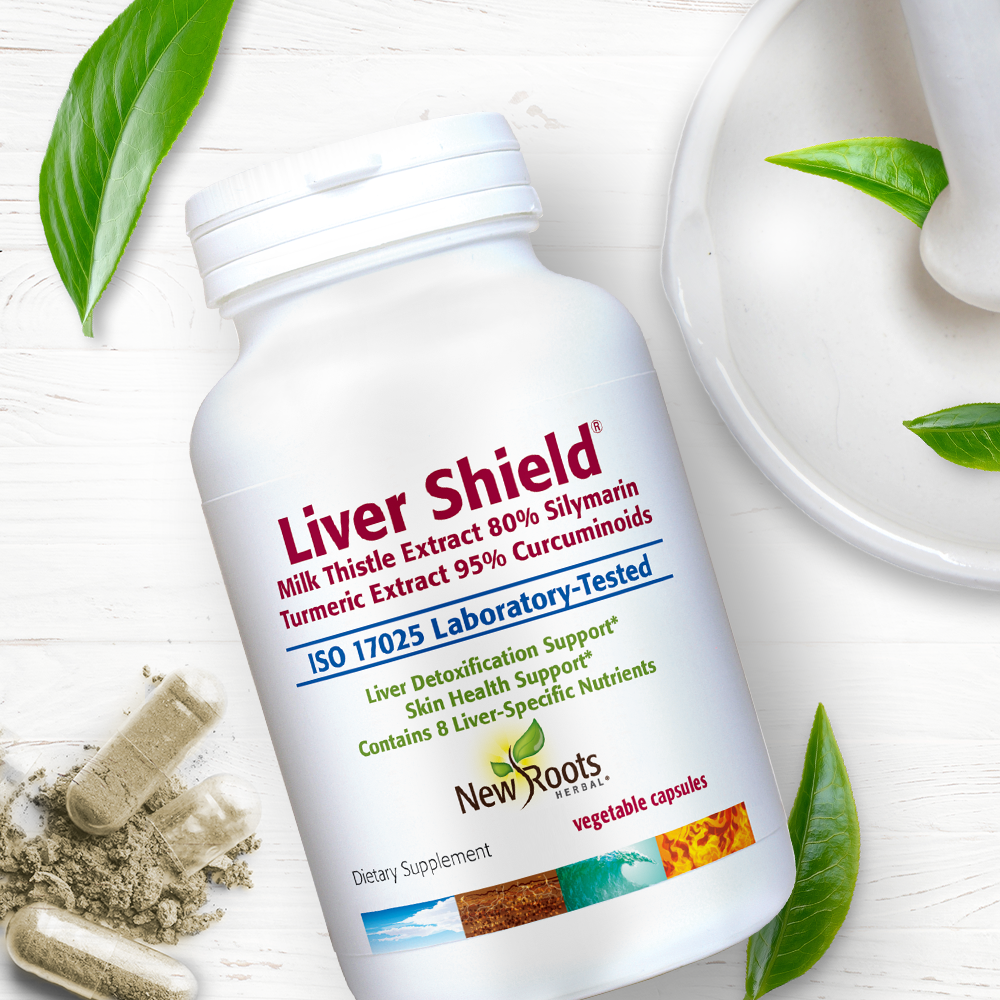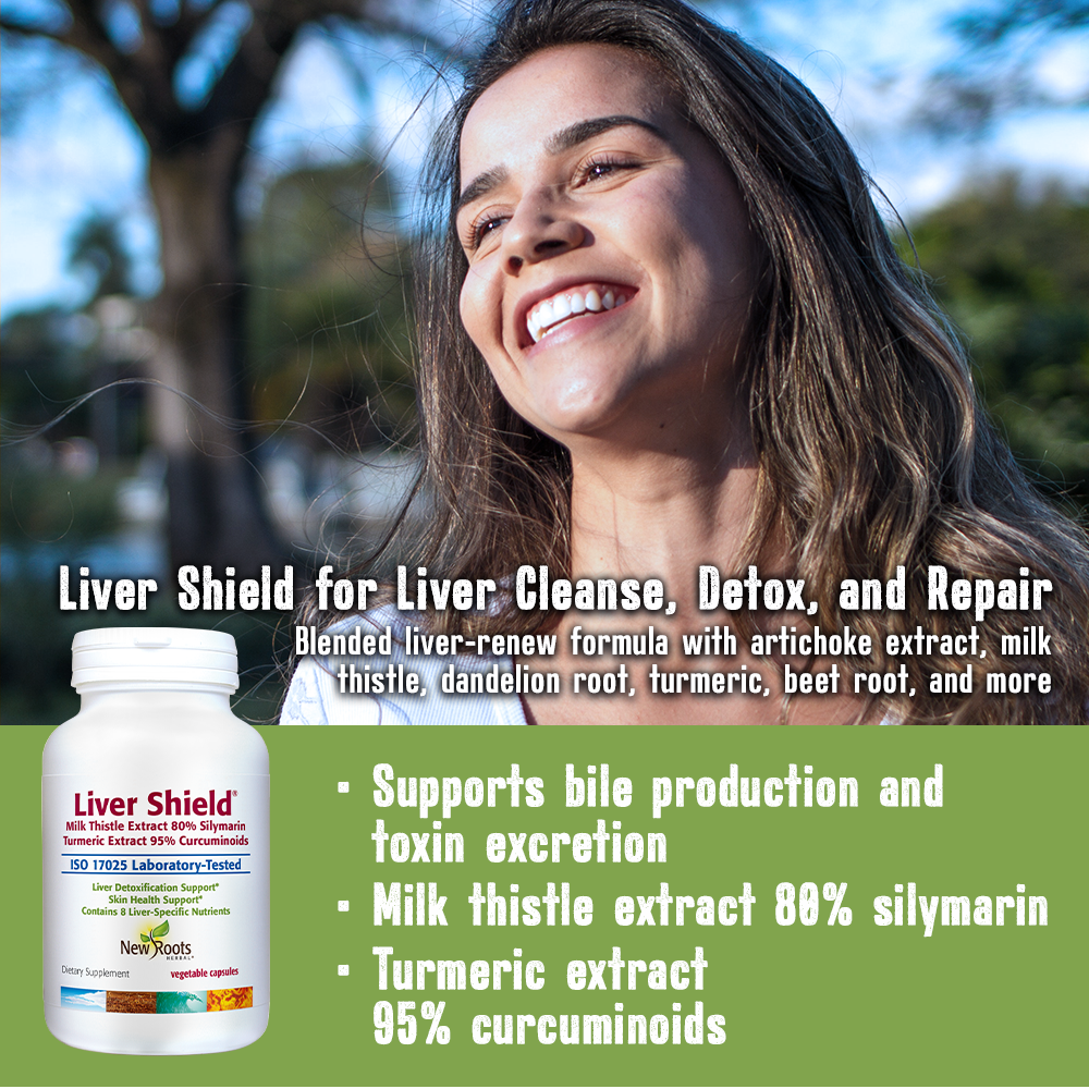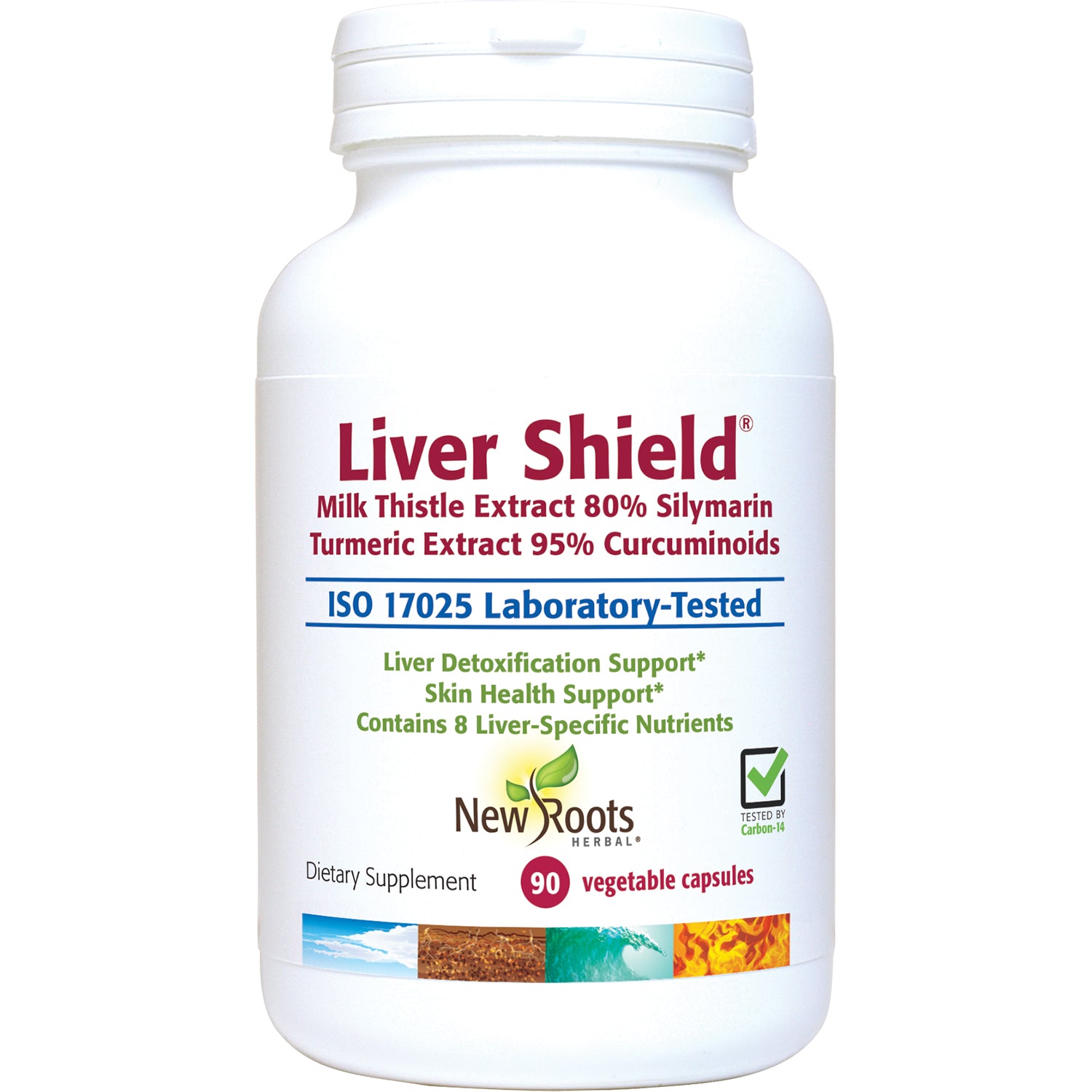 New Roots Herbal Liver Shield is formulated with potency-validated botanical extracts traditionally used to protect and support liver function. Live Shield features 250 mg per capsule of milk thistle extract with a potency standardized to 80% silymarin. Silymarin is a well-researched compound recognized to protect liver cells. Seven additional nutrients exert a synergistic action beneficial for the liver. This supports its critical role for bile production and toxin excretion.