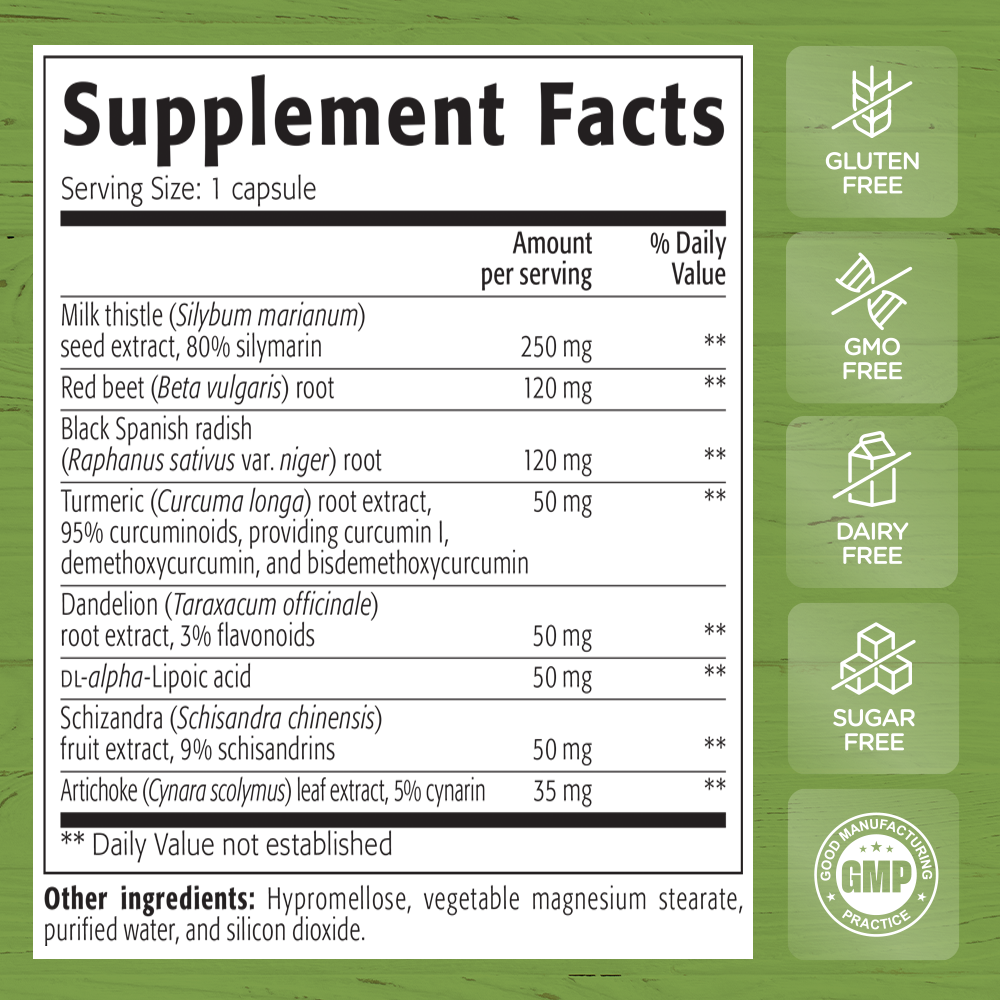 | Ingredients | Each capsule contains: Each vegetable capsule contains: Milk thistle (Silybum marianum) seed extract, 80% silymarin250 mg Black Spanish radish (Raphanus sativus var. niger) root120 mg Red beet (Beta vulgaris) root120 mg Dandelion (Taraxacum officinale) root extract, 3% flavonoids50 mg ᴅʟ‑alpha‑Lipoic acid50 mg Schizandra (Schisandra chinensis) fruit extract, 9% schisandrins50 mg Turmeric (Curcuma longa) root extract, 95% curcuminoids, providing curcumin I, demethoxycurcumin, and bisdemethoxycurcumin50 mg Artichoke (Cynara scolymus) leaf extract, 5% cynarin35 mg Other ingredients: Vegetable magnesium stearate and silicon dioxide in a non‑GMO vegetable capsule composed of carbohydrate gum and purified water. |