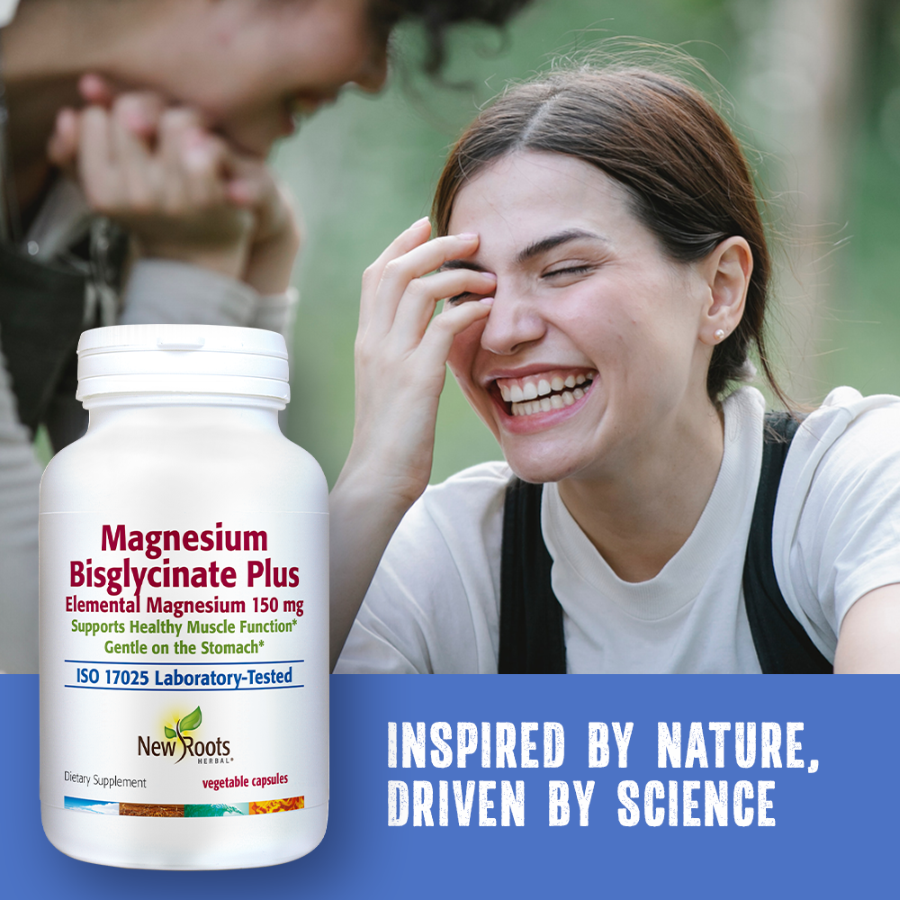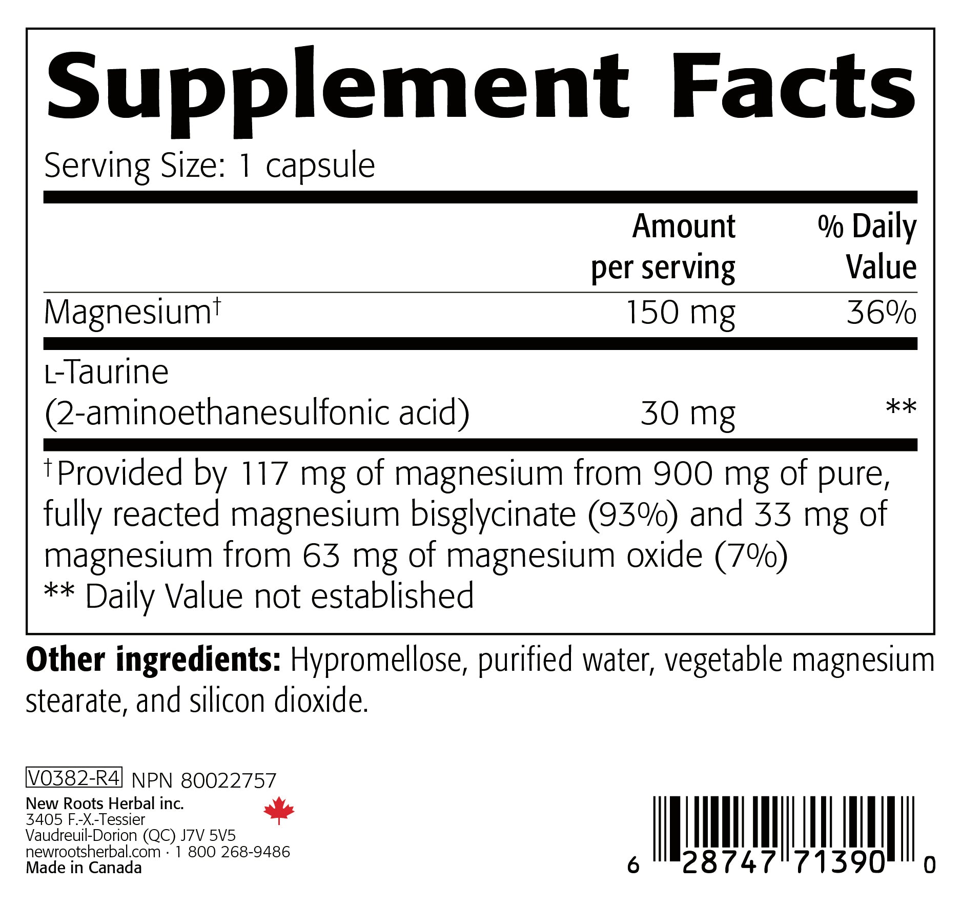 Magnesium is involved in more than 600 enzymic reactions in the body. Many adults do not get enough of this crucial mineral from diet alone. A magnesium deficiency can manifest in a number of ways, including muscle soreness, fatigue, poor blood sugar metabolism, and poor sleep. New Roots Herbal's Magnesium Bisglycinate helps to maintain the body’s ability to metabolize nutrients; in the development and maintenance of bones and teeth; in tissue formation; to maintain proper muscle function, including the heart muscle; and to maintain normal electrolyte balance. Magnesium has wide-ranging effects in the body and may influence some of the processes that promote sleep.