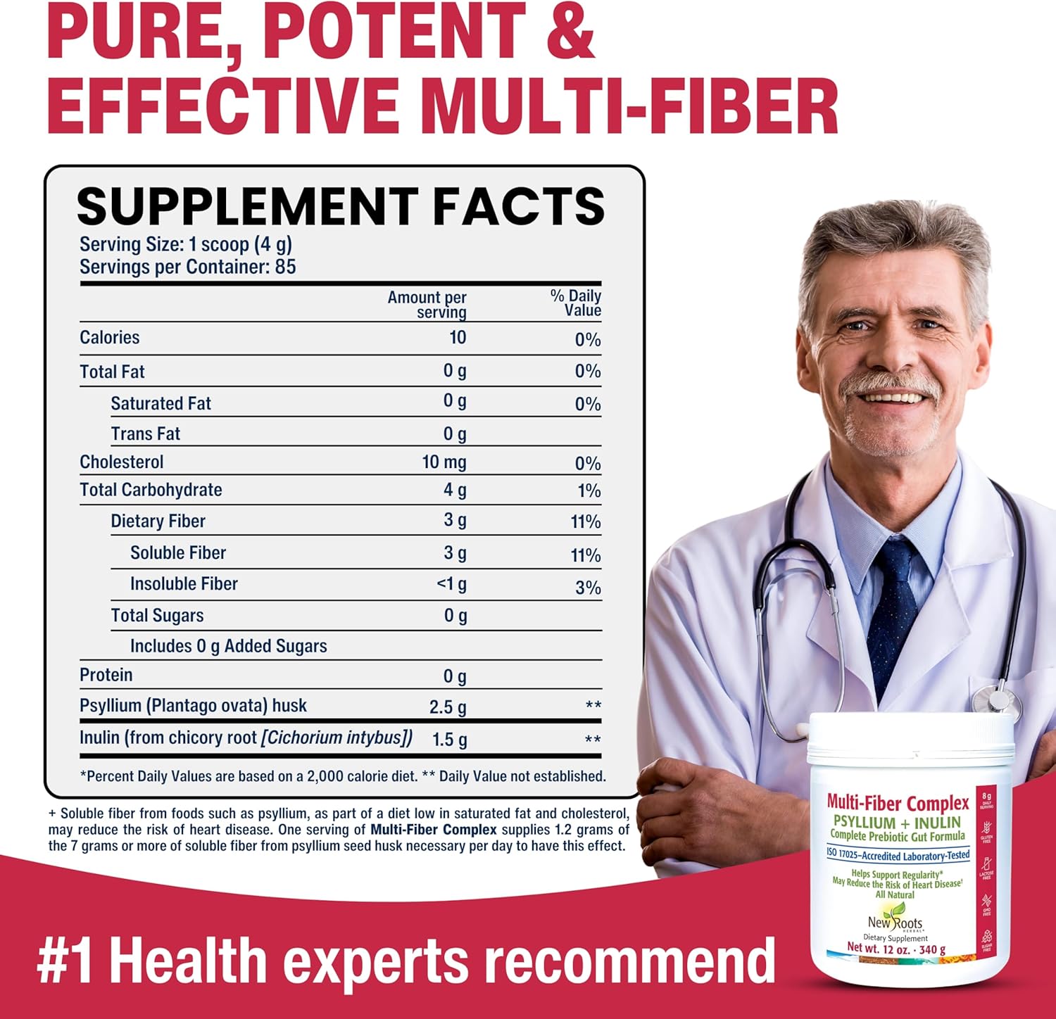 - HIGH FIBER CONCENTRATION; 1 scoop, three times daily, provides up to 12 grams of combined soluble (Psyllium Husk) and insoluble (Inulin from Chicory root) fiber. Multi-Fiber Complex, in combination with healthy eating habits, can help bring you to the American Heart Association recommended daily fiber intake of 25 to 30 grams per day.