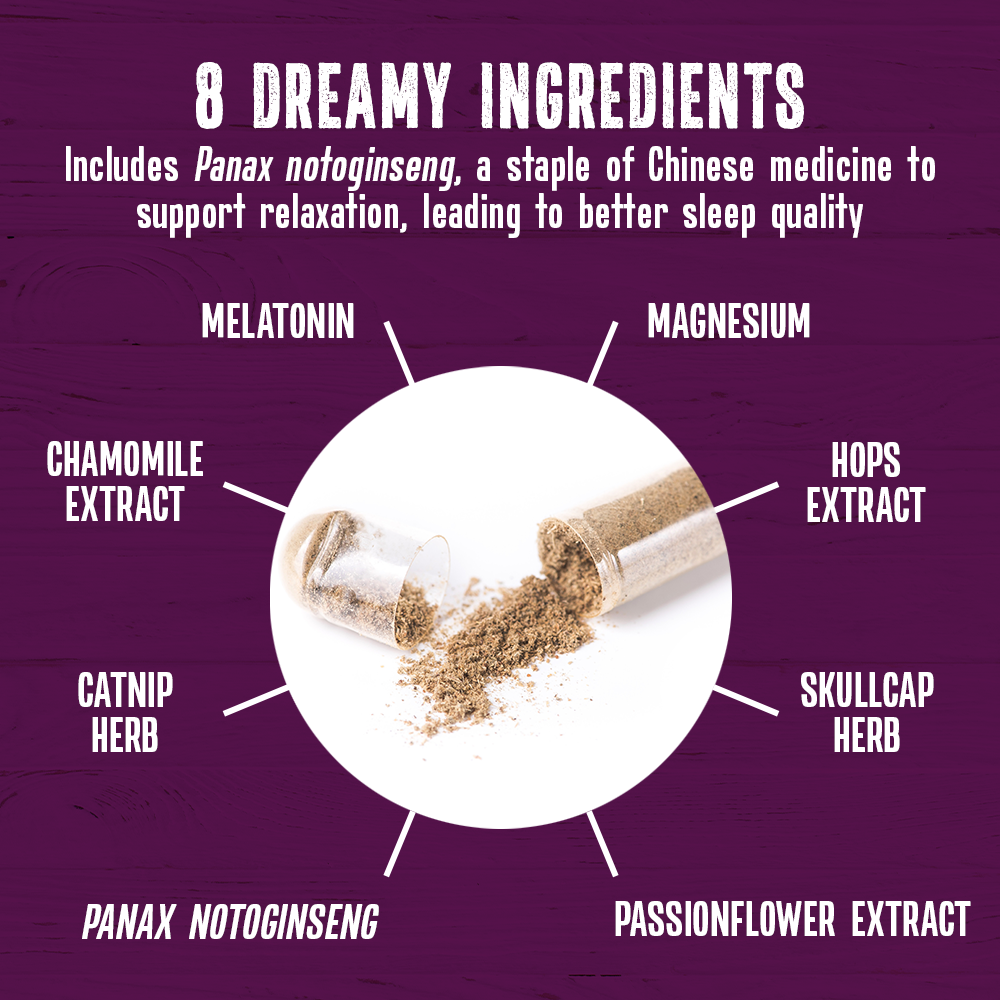 | Ingredients | Each vegetable capsule contains: Chamomile (Matricaria recutita) flower extract, Hops (Humulus lupulus) strobile extract, Passionflower (Passiflora incarnata) flower extract, Skullcap (Scutellaria lateriflora), Qiye Shen’an Pian (Panax notoginseng) leaf extract, Magnesium, Catnip (Nepeta cataria) herb, Melatonin. Other ingredients: Vegetable magnesium stearate and silicon dioxide in a non‑GMO vegetable capsule composed of vegetable carbohydrate gum and purified water. |