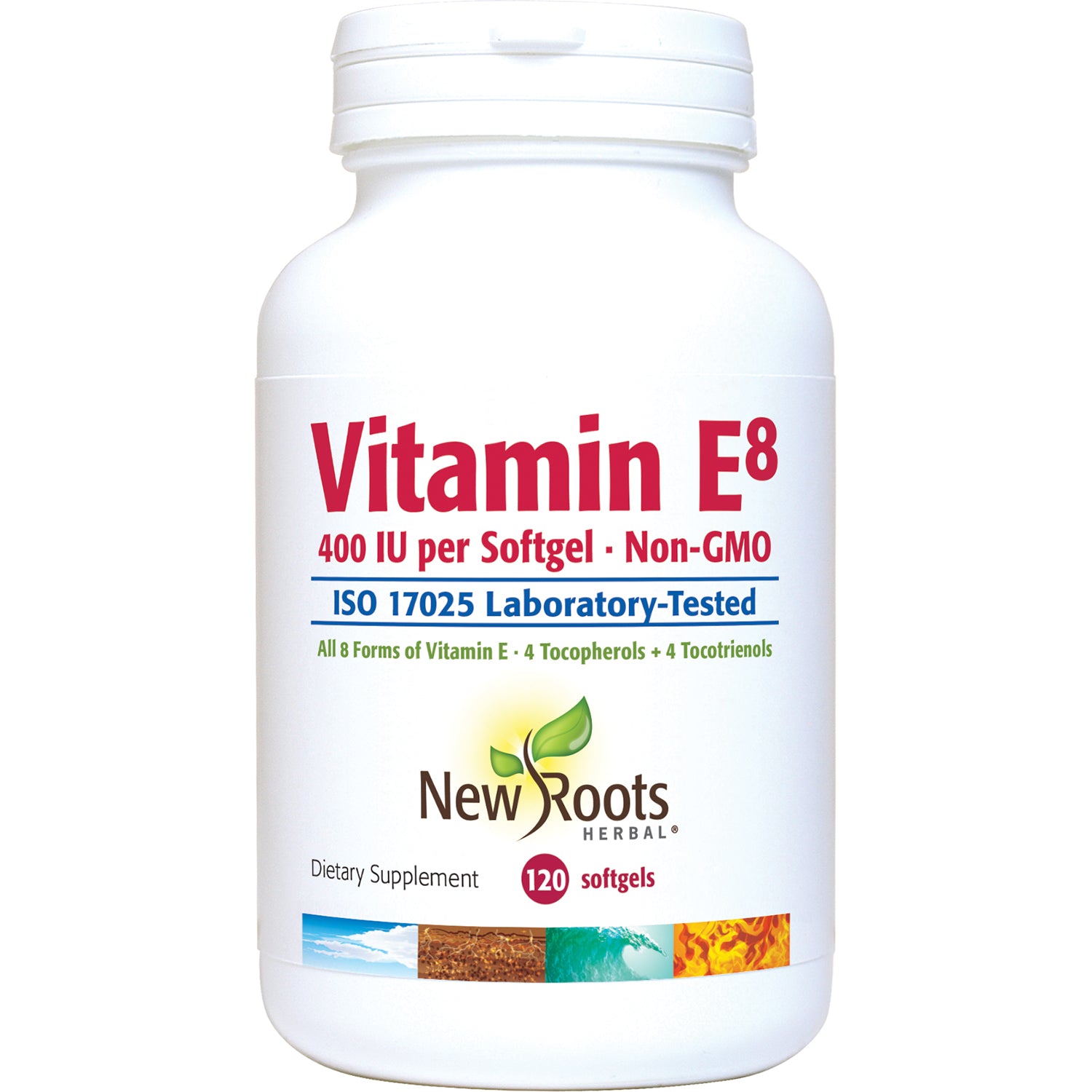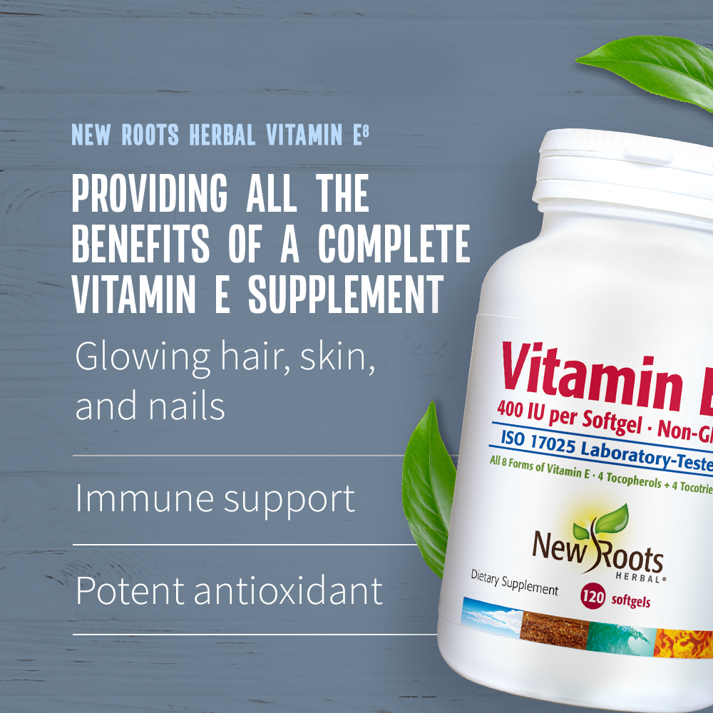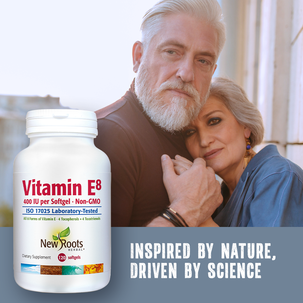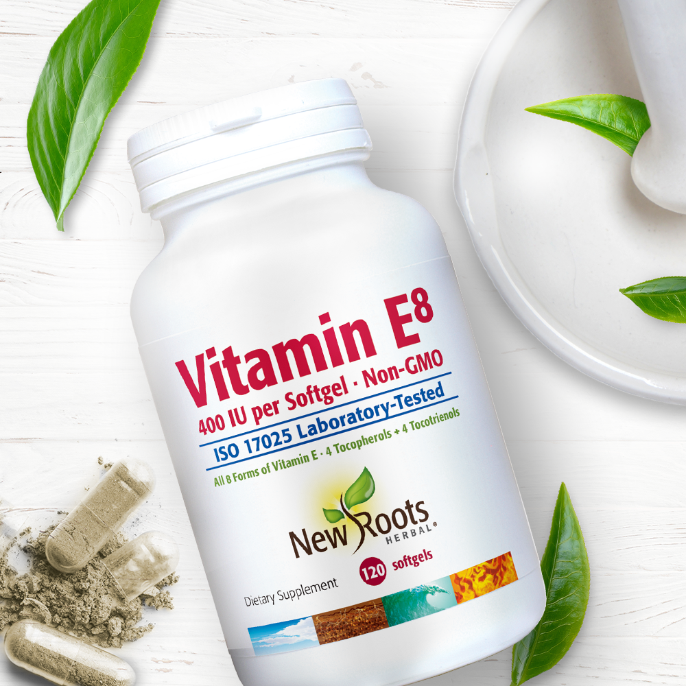 New Roots Herbal’s Vitamin E⁸ contains all eight forms of vitamin E—four tocopherols and four tocotrienols—with squalenes, beta-sitosterols, all non-GMO certified.